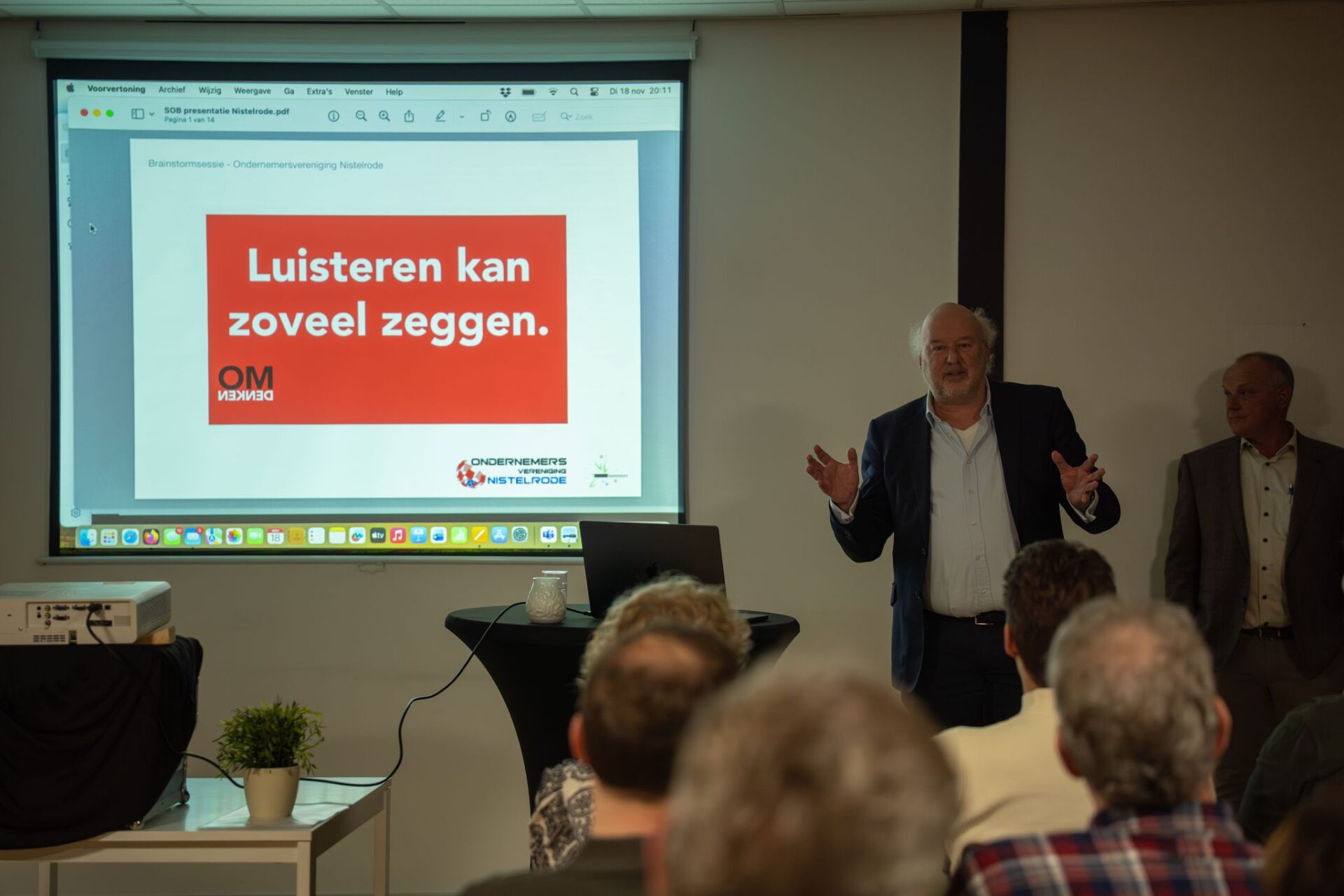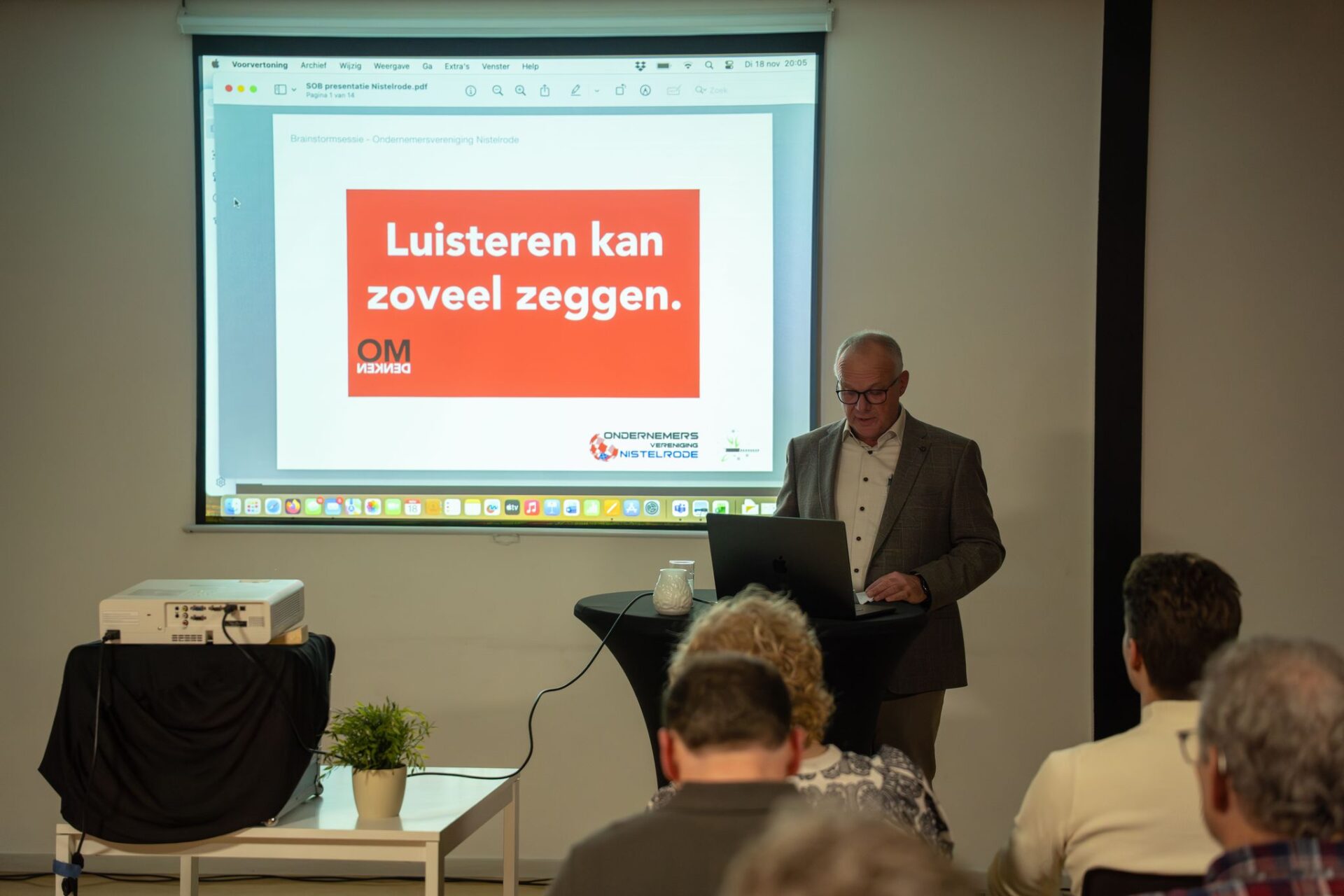 Tijdens de jaarlijkse ledenvergadering van de Ondernemersvereniging Nistelrode kwamen op 18 november ruim 50 ondernemers bijeen bij Intense Cosmedische Huidpraktijk van Karin Manders. Voorzitter Mario van Dijk opende de avond met een warm welkom voor alle aanwezigen, waaronder de heer René Jetten namens gemeente Bernheze. Ook werd het team van Intense Cosmedisch Huidpraktijk bedankt voor hun gastvrijheid op deze prachtige locatie.