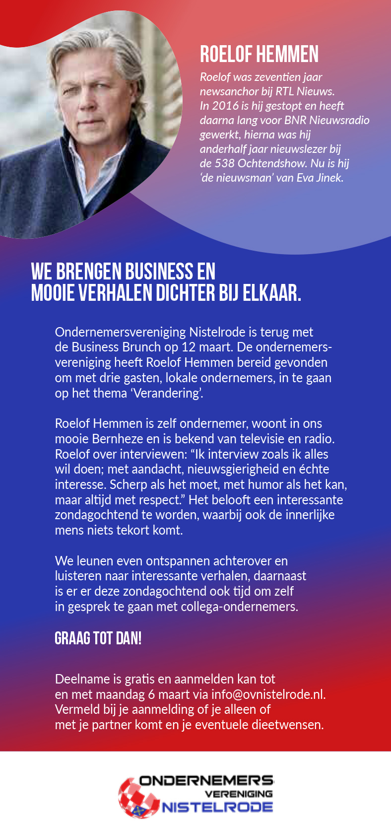 NISTELRODE – Bij Zaal De Hoefslag ontving Ondernemersvereniging Nistelrode zondagochtend 12 maart 70 ondernemers die zich aan hadden gemeld voor de Business Brunch. Niemand minder dan Roelof Hemmen werd bereid gevonden om drie gasten tijdens een rondetafelgesprek hun verhaal te laten vertellen, met als thema ‘Verandering’.
