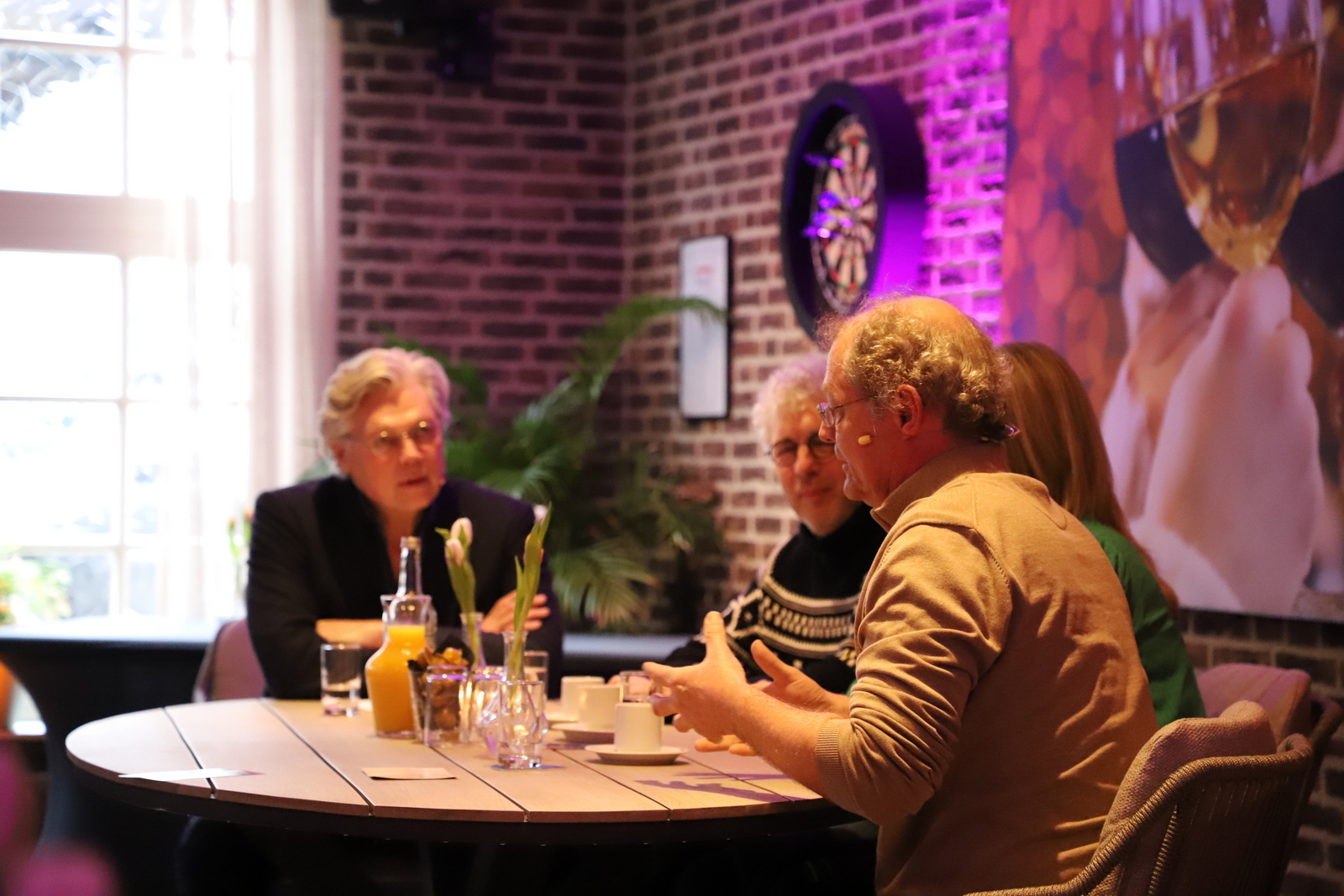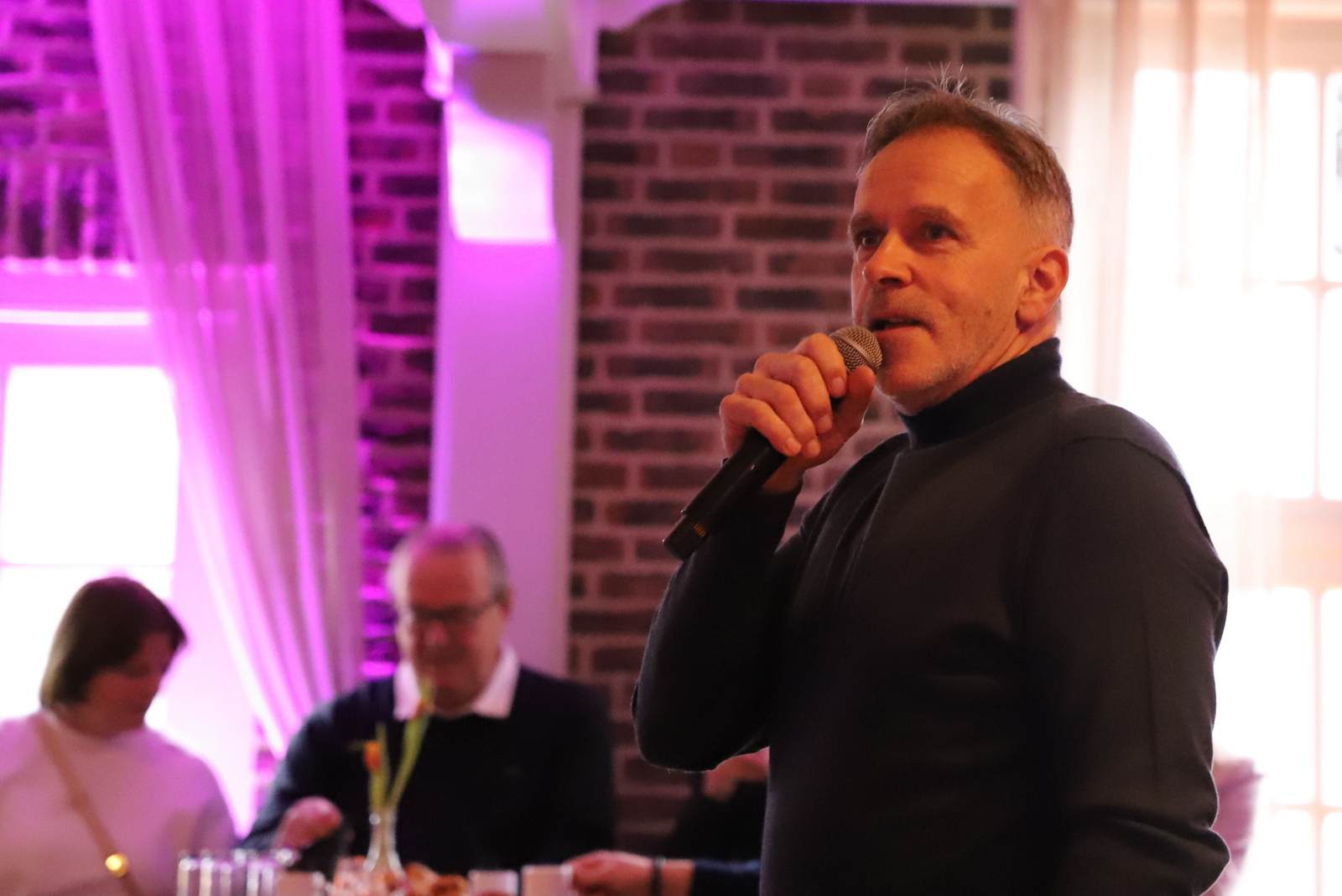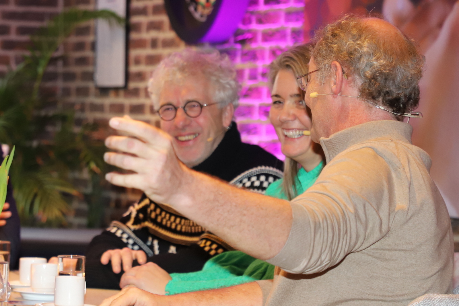 De sfeervolle zaal werd omgetoverd tot een talkshowdecor. De drie gasten, die allen lid van de ondernemersvereniging zijn, maakten stuk voor stuk bijzondere veranderingen door in hun ondernemersbestaan. Pieter van den Akker van Driestroomhuis Nistelrode, Monique van de Beeten van Aannemersbedrijf Van de Beeten en Ron de Lorijn van Eetcafé ’t Pumpke werden door Roelof op professionele wijze in een bijzonder onderhoudend gesprek bevraagd over de keuzes die ze maakten, wat dit voor hen persoonlijk betekende, maar ook voor de kwaliteit van hun leven.
