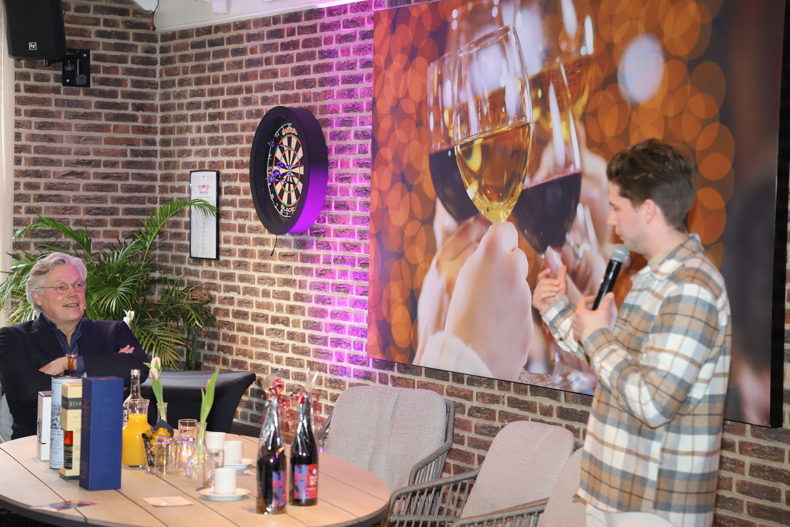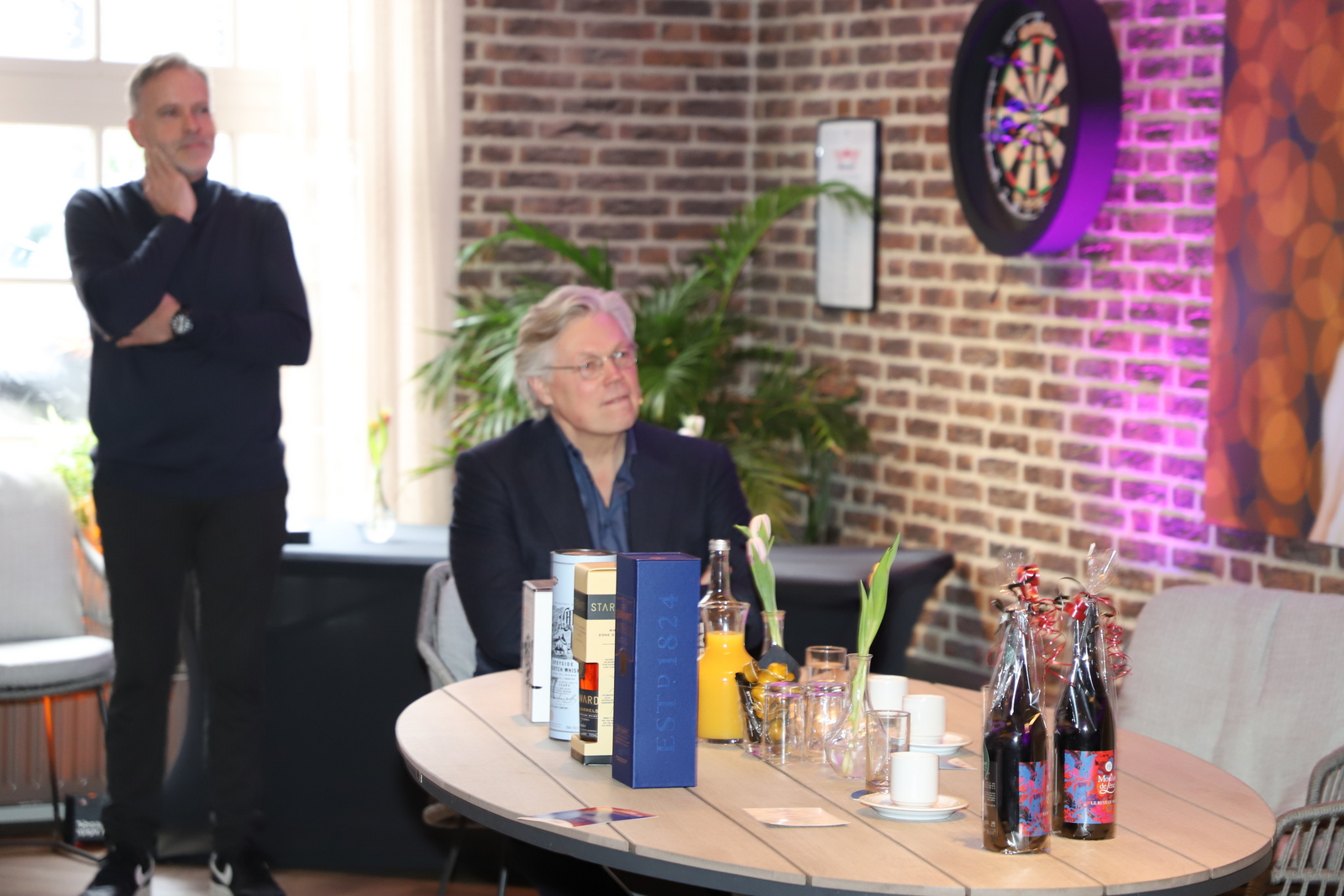 De dankbaarheid voor de komst van Roelof Hemmen werd door het bestuur getoond door een korte whiskypresentatie, leuk voor de whiskykenner. Hierna kon Roelof een keuze maken uit de verfijnde whisky’s die Mike van der Walle van Borrelpunt meegebracht had. Marion, de vrouw van Roelof, ontving een mooie bos bloemen uit handen van Theo van den Heuvel, bestuurslid van Ondernemersvereniging Nistelrode. Hij bedankte ook Rian van Schijndel voor het organiseren van deze mooie bijeenkomst. Hierna wenste Theo alle ondernemers smakelijk eten, waarna het team van De Hoefslag zorgde dat de magen gevuld werden terwijl iedereen, onder het genot van een drankje, gezellig kon bijpraten.
